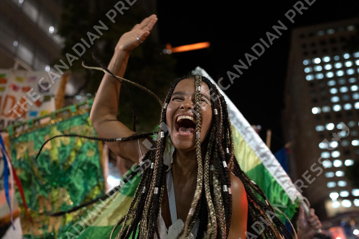 A reveller of a street party known as blocos, dances during a protest against restrictions by city officials in Rio de Janeiro, Brazil, Wednesday, April 13, 2022. City Hall has banned the street parties during Carnival celebrations, which were delayed by almost two months due to the pandemic. (AP Photo/Silvia Izquierdo)