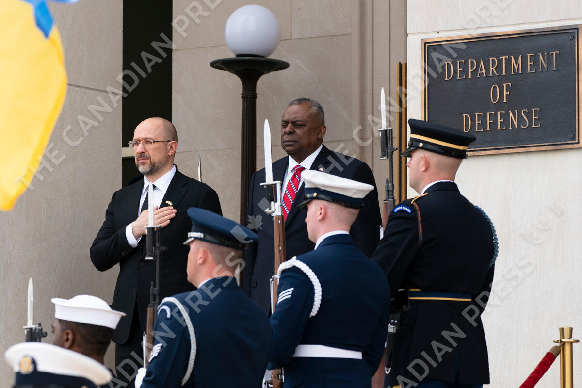 Secretary of Defense Lloyd Austin stands with Ukrainian Prime Minister Denys Shmyhal during an arrival ceremony at the Pentagon, Thursday, April 21, 2022, in Washington. (AP Photo/Manuel Balce Ceneta)