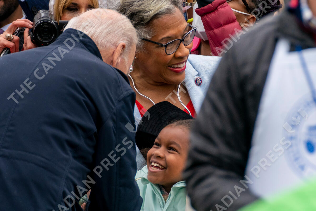 President Joe Biden greets a girl in the audience during the White House Easter Egg Roll on the South Lawn of the White House, Monday, April 18, 2022, in Washington. (AP Photo/Andrew Harnik)