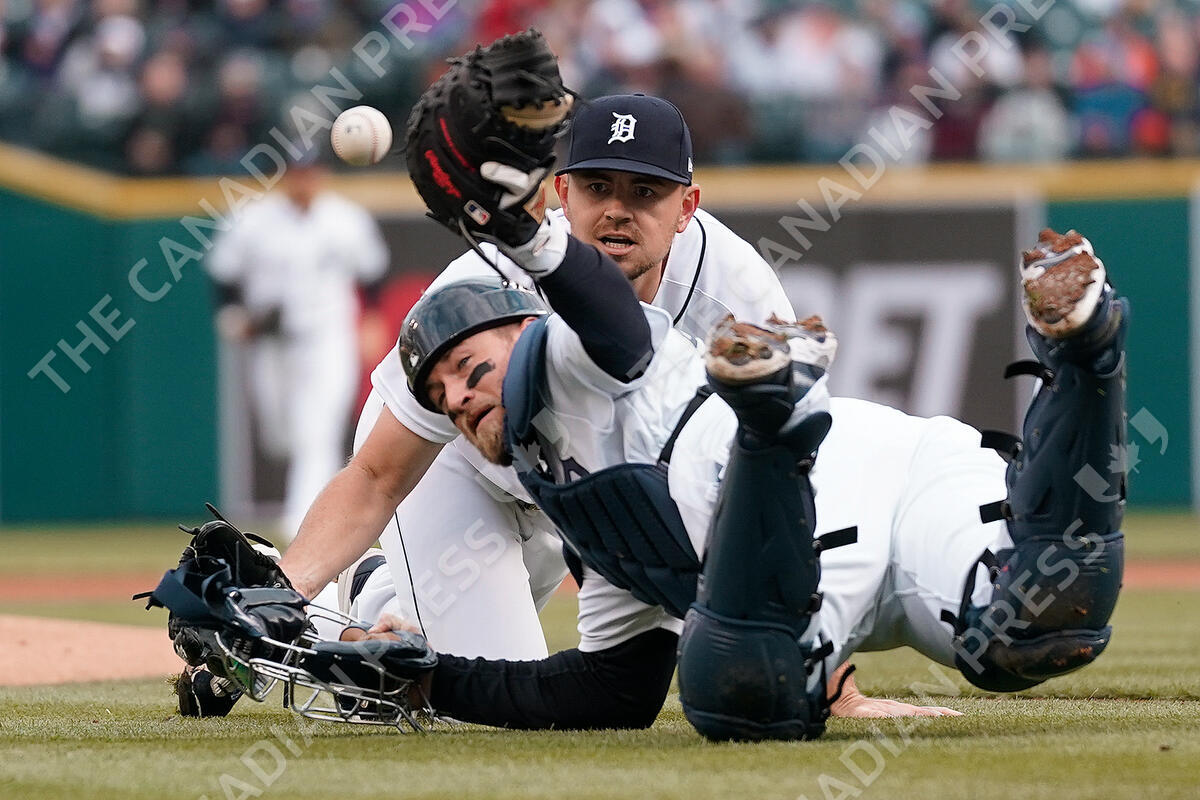 Detroit Tigers catcher Tucker Barnhart (15) tries to catch a New York Yankees third baseman Josh Donaldson (28) fly ball as pitcher Tyler Alexander looks on in the first inning of a baseball game in Detroit, Tuesday, April 19, 2022. Alexander was given a fielding error and two runs scored. (AP Photo/Paul Sancya)