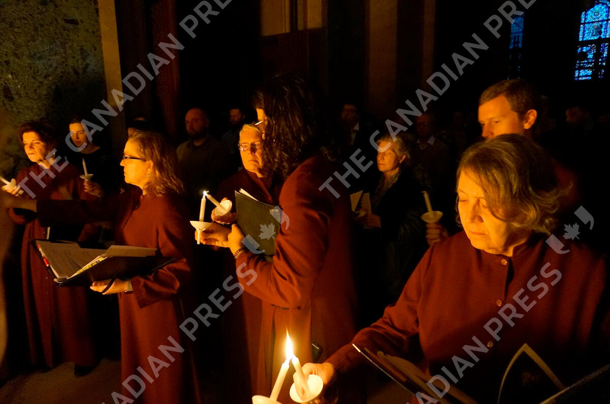 Members of the choir light candles at the beginning of the Easter Vigil Mass at the Cathedral of St. Paul in St. Paul, Minn.,, on Saturday, April 16, 2022. For many U.S. Christians, this weekend marks the first time since 2019 that they will gather in person on Easter Sunday, a welcome chance to celebrate one of the year's holiest days side by side with fellow congregants. (AP Photo/Giovanna Dell'Orto)