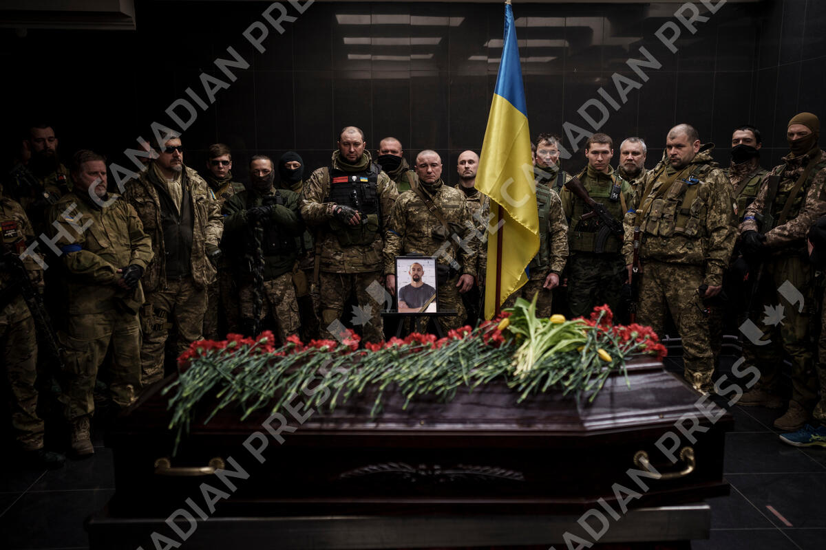 Ukrainian servicemen attend the funeral ceremony of marine Alexandr Khovtun, in Kyiv, Ukraine, Sunday, March 20, 2022. Khovtun died in combat in the town of Huta-Mezhyhirska, north of Kyiv. (AP Photo/Felipe Dana)