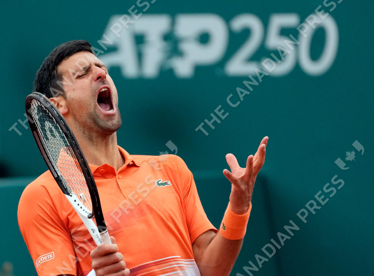 Novak Djokovic of Serbia reacts during their quarter final tennis match of the Serbia Open tennis tournament against Miomir Kecmanovic of Serbia, in Belgrade, Serbia, Thursday, April 21, 2022. (AP Photo/Darko Vojinovic)