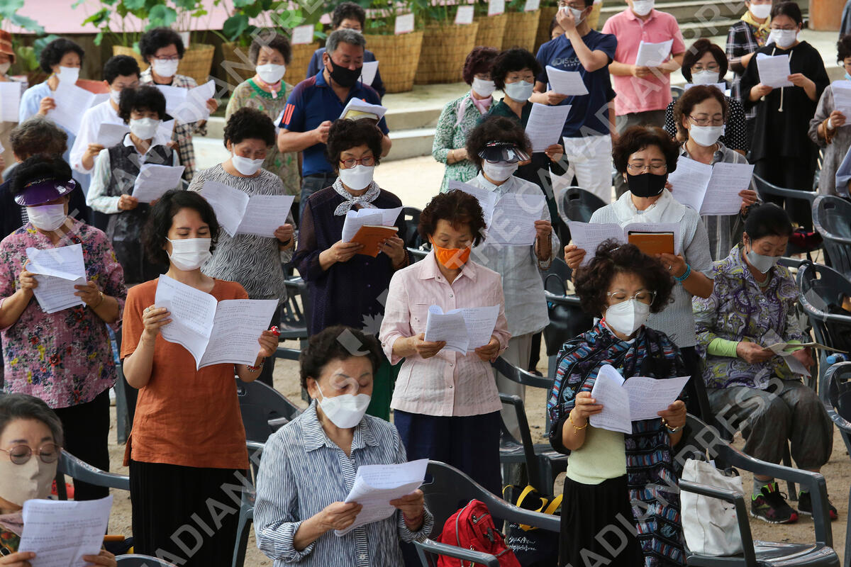 People wearing face masks to help protect against the spread of the coronavirus pray while maintaining social distancing during a service at the Chogyesa temple in Seoul, South Korea, Sunday, Aug. 23, 2020. (AP Photo/Ahn Young-joon)