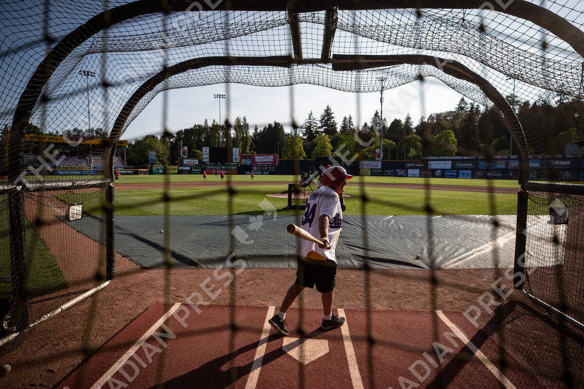Al Vyner steps away from the plate after participating in a fan batting practice session hosted by the Vancouver Canadians minor league baseball team at Nat Bailey Stadium, in Vancouver, on Thursday, September 3, 2020. Participants paid $50 for a 30-pitch session and also receive two ticket vouchers for a 2021 season game. The team is able to host the sessions, which adhere to provincial health guidelines limiting public gatherings to 50 people, due to the cancelation of their season because of COVID-19. The Canadians are the Class A Short Season Northwest League affiliate of the Toronto Blue Jays. THE CANADIAN PRESS/Darryl Dyck