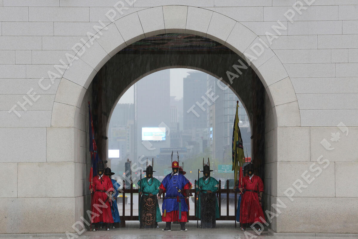 Imperial guards wearing face masks to help protect against the spread of the new coronavirus shelter from the rain under the gate of the Gwanghwamun at the Gyeongbok Palace, the main royal palace during the Joseon Dynasty, in Seoul, South Korea, Friday, April 17, 2020. (AP Photo/Ahn Young-joon)