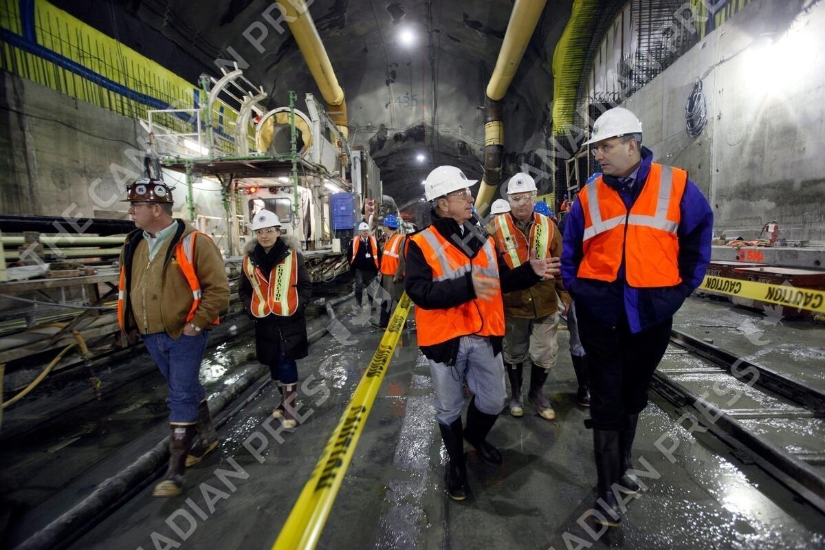 File- In this Feb. 3, 2010 file photo, New York City Mayor Michael Bloomberg, center, and MTA Chairman and CEO Jay Walder, right, tour the massive cavern for the new 34th Street Station. Hudson Yards, which opened this March, was part of the roughly 40 percent of the city that was rezoned during Bloomberg's tenure. (AP Photo/Mary Altaffer, file)