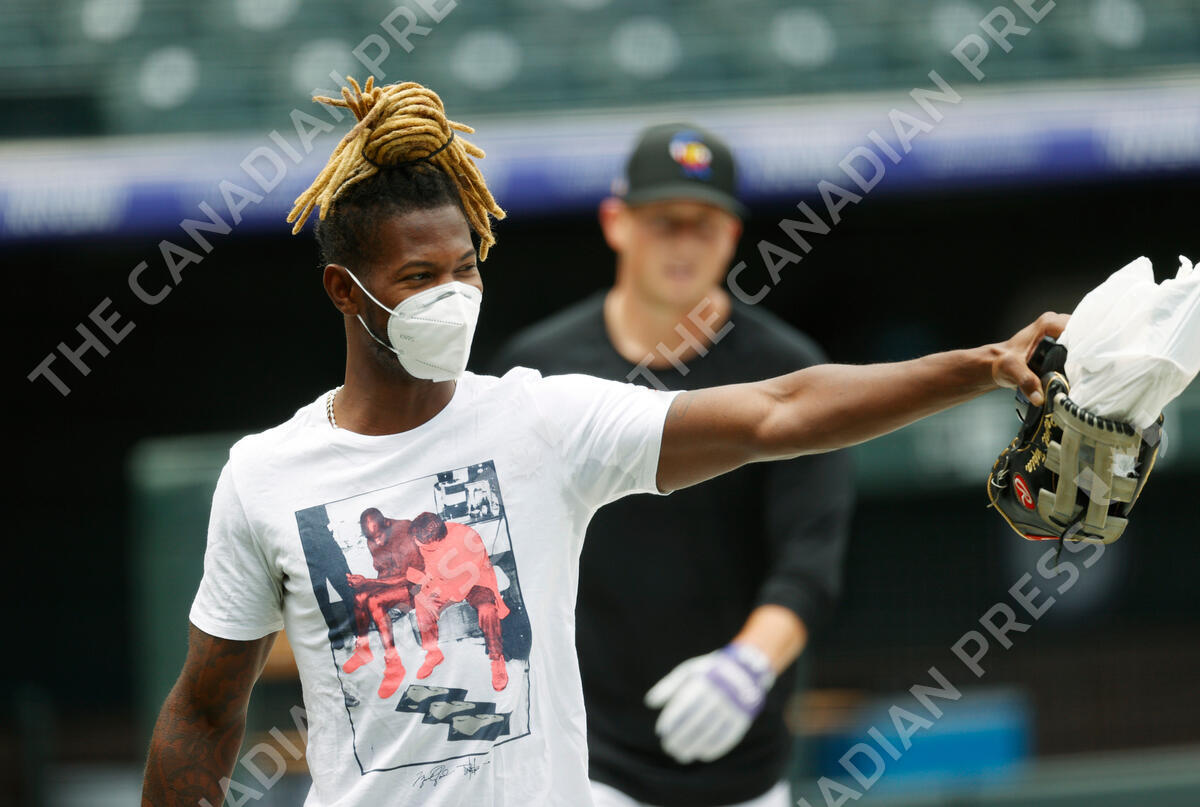 Colorado Rockies left fielder Raimel Tapia heads to the clubhouse as the team practices in Coors Field Saturday, July 4, 2020, in Denver. (AP Photo/David Zalubowski)