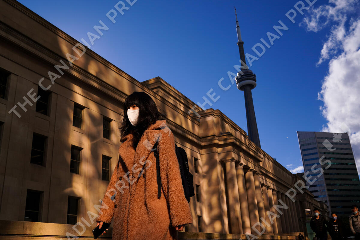 A woman wearing a face mask to help curb the spread of COVID-19 walks along Front Street in Toronto on Monday, November 1, 2021. THE CANADIAN PRESS/Evan Buhler