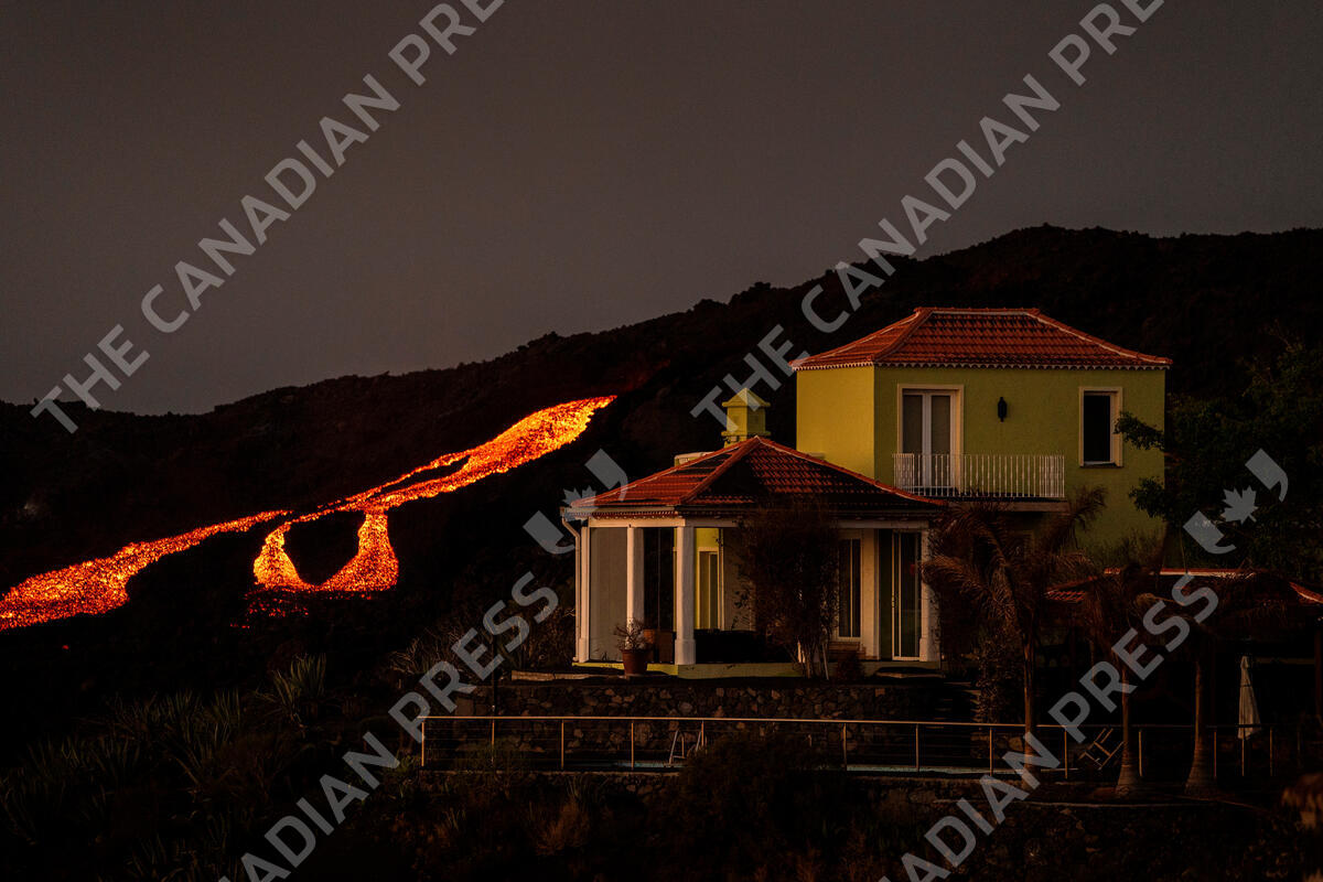 Lava flows from a volcano as it continues to erupt on the Canary island of La Palma, Spain Spain, Monday, Nov. 1, 2021. A volcano on the Spanish island of La Palma that has been erupting for six weeks has spewed more ash from its main mouth a day after producing its strongest earthquake to date. (AP Photo/Emilio Morenatti)