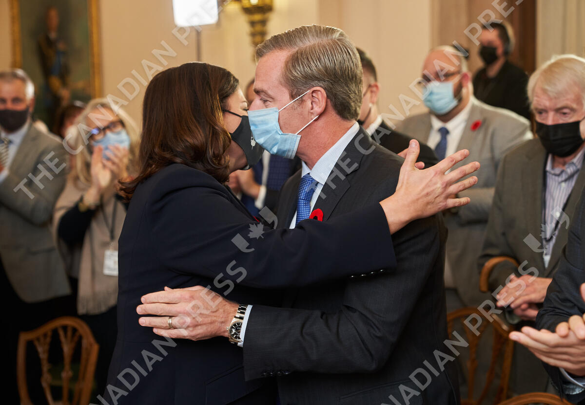 Heather Stefanson embraces her husband Jason as she is sworn in as Manitoba's 24th premier at the Manitoba Legislative Building in Winnipeg on Tuesday, November 2, 2021. THE CANADIAN PRESS/David Lipnowski