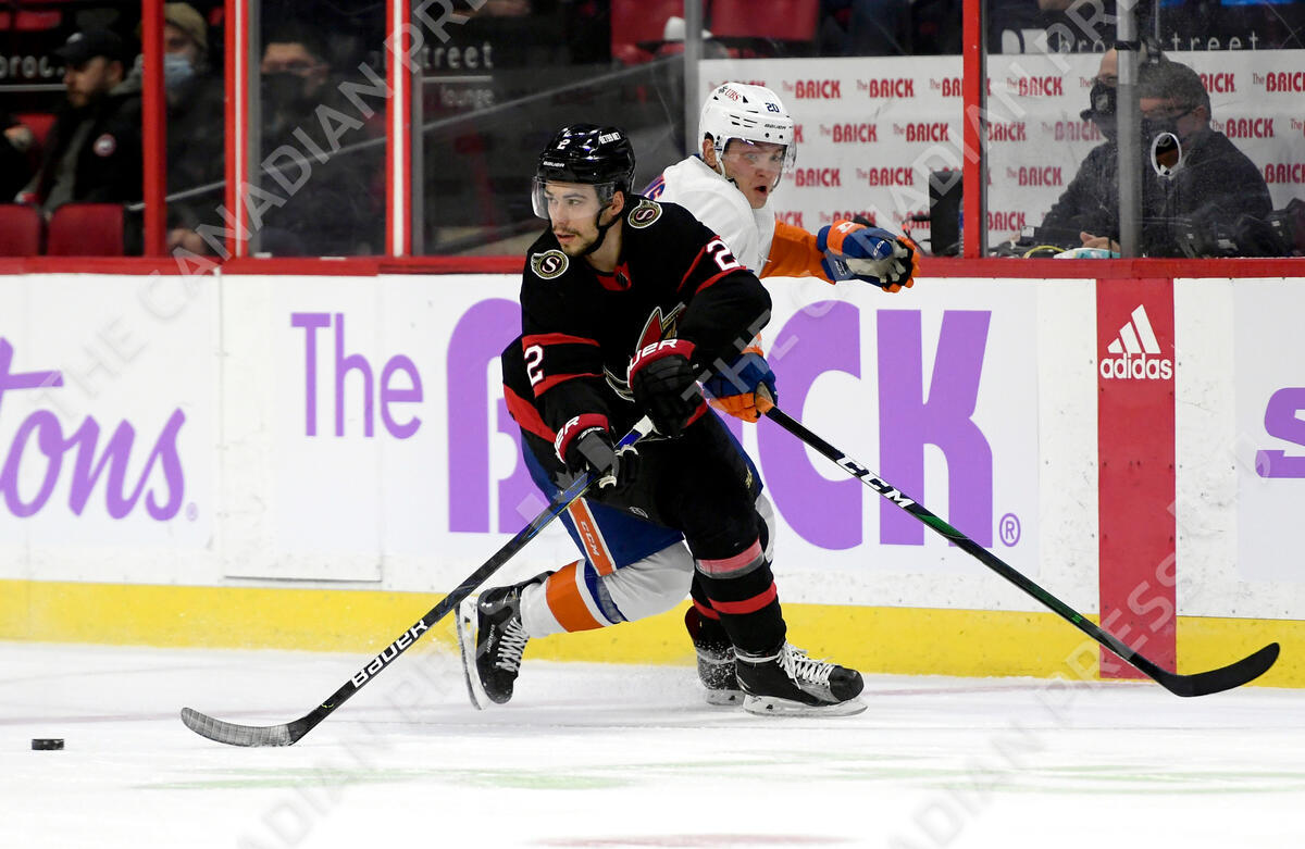 New York Islanders left wing Kieffer Bellows (20) tries to get his stick around Ottawa Senators defenceman Artem Zub (2) during first period NHL hockey action in Ottawa, on Tuesday, Dec. 7, 2021. THE CANADIAN PRESS/Justin Tang