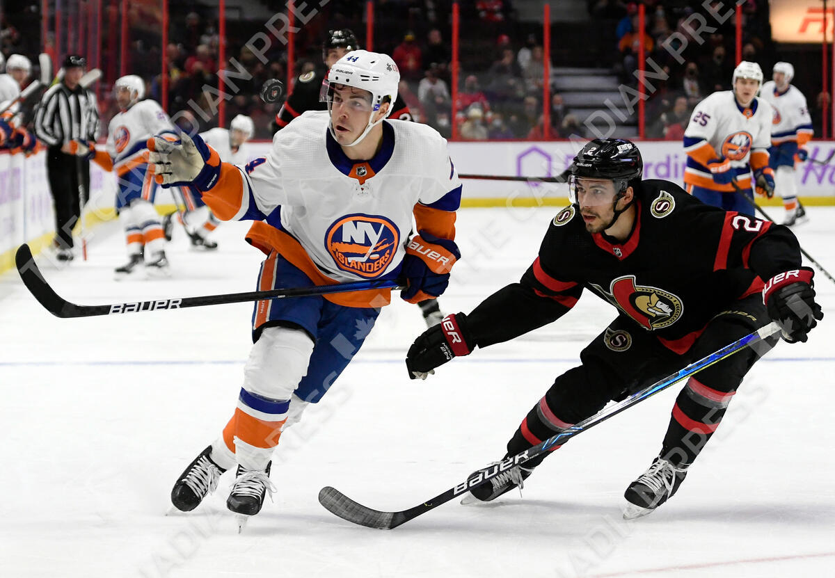 New York Islanders centre Jean-Gabriel Pageau (44) puts his glove out for a bouncing puck as he skates beside Ottawa Senators defenceman Artem Zub (2) during first period NHL hockey action in Ottawa, on Tuesday, Dec. 7, 2021. THE CANADIAN PRESS/Justin Tang