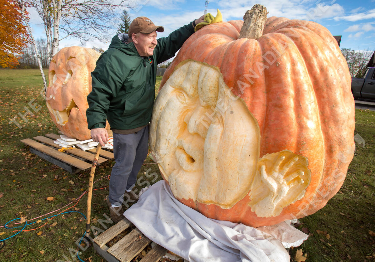 Known as the largest pumpkin grower in Canada, Phil Hunt is shown with this 1650 lb. behemoth at his home in Cameron Ont., on Sunday, October 31, 2021. While he lost his title to a Quebec farmer this year that's okay says Phil. I'm hanging it up, retiring he said. "It's time for someone else to carry on the tradition." His last big one is on display on the east side of Hwy 35 just north of Cameron. THE CANADIAN PRESS/Fred Thornhill