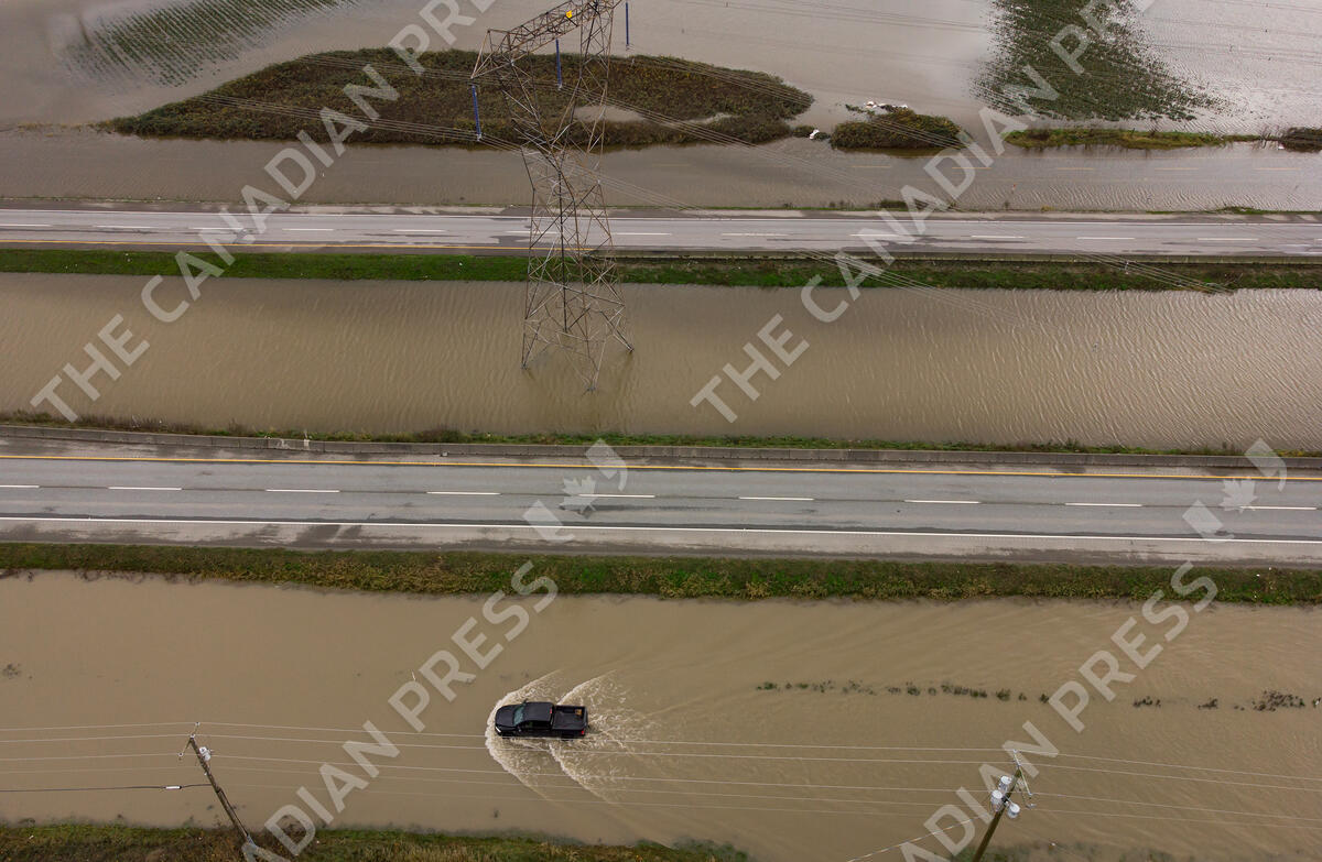 A motorist drives on a service road along the closed Trans-Canada Highway as floodwaters fill the ditches beside the highway and farmland in Abbotsford, B.C., on Wednesday, December 1, 2021. THE CANADIAN PRESS/Darryl Dyck