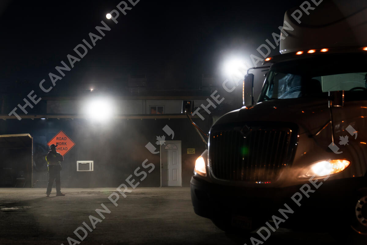 Evening class instructor Pavel Cruz, left, stands in a dusty lot as his student practices steering a truck at California Truck Driving Academy in Inglewood, Calif., Wednesday, Nov. 17, 2021. Business is booming at a truck-driving academy in suburban Los Angeles amid a nationwide shortage of long-haul drivers. The California Truck Driving Academy in Inglewood has seen annual enrollment grow by almost 20% since last year. (AP Photo/Jae C. Hong)