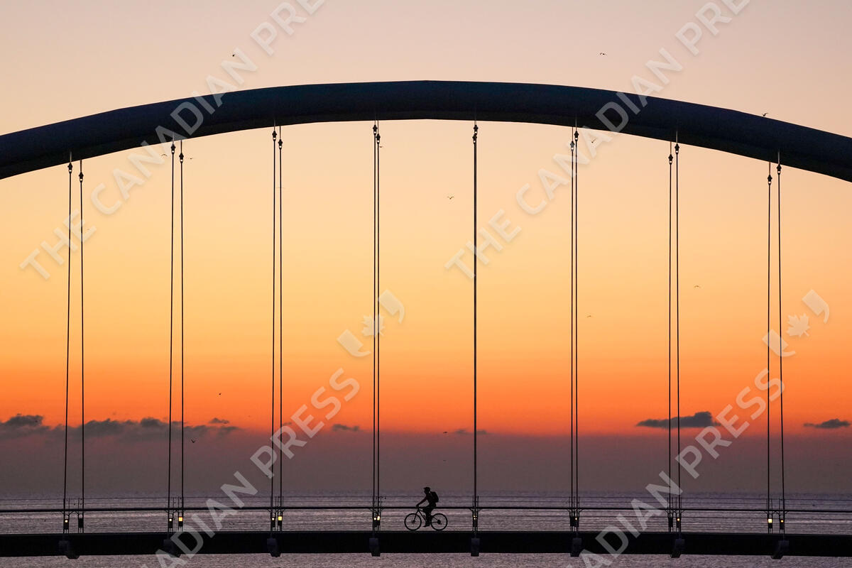 A cyclist crosses Humber Bay Arch Bridge during sunrise in Toronto on Friday, November 5, 2021. THE CANADIAN PRESS/Evan Buhler