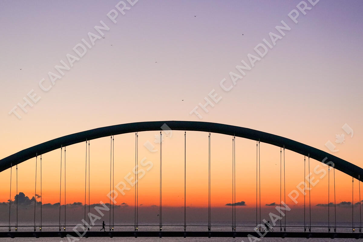 A jogger and a cyclist cross Humber Bay Arch Bridge during sunrise in Toronto on Friday, November 5, 2021. THE CANADIAN PRESS/Evan Buhler