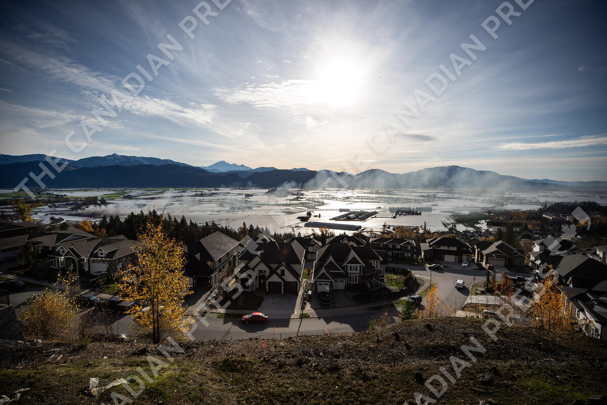 Recreational vehicles and trucks burn during a fire at a business surrounded by floodwaters in Abbotsford, B.C., on Wednesday, November 17, 2021. THE CANADIAN PRESS/Darryl Dyck
