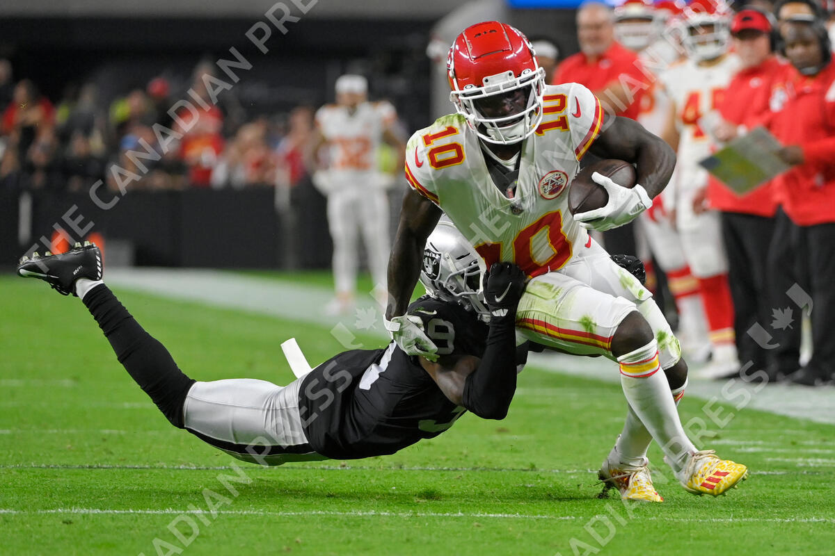Kansas City Chiefs wide receiver Tyreek Hill (10) breaks a tackle by Las Vegas Raiders cornerback Nate Hobbs (39) during the first half of an NFL football game, Sunday, Nov. 14, 2021, in Las Vegas. (AP Photo/David Becker)