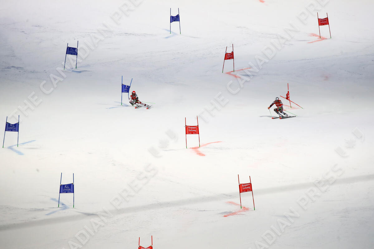 Austria's Christian Hirschbuehl, left, competes alongside Norway's Henrik Kristoffersen during an alpine ski, men's World Cup parallel event, in Lech/Zuers, Austria, Sunday, Nov. 14, 2021. (AP Photo/Marco Trovati)