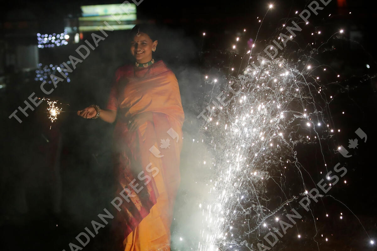 A woman celebrates Diwali at Shivaji park in Mumbai, India, Thursday, Nov. 4, 2021. Diwali, the festival of lights, is one of Hinduism's most important festivals dedicated to the worship of Lakshmi, the Hindu goddess of wealth. (AP Photo/Rajanish kakade)