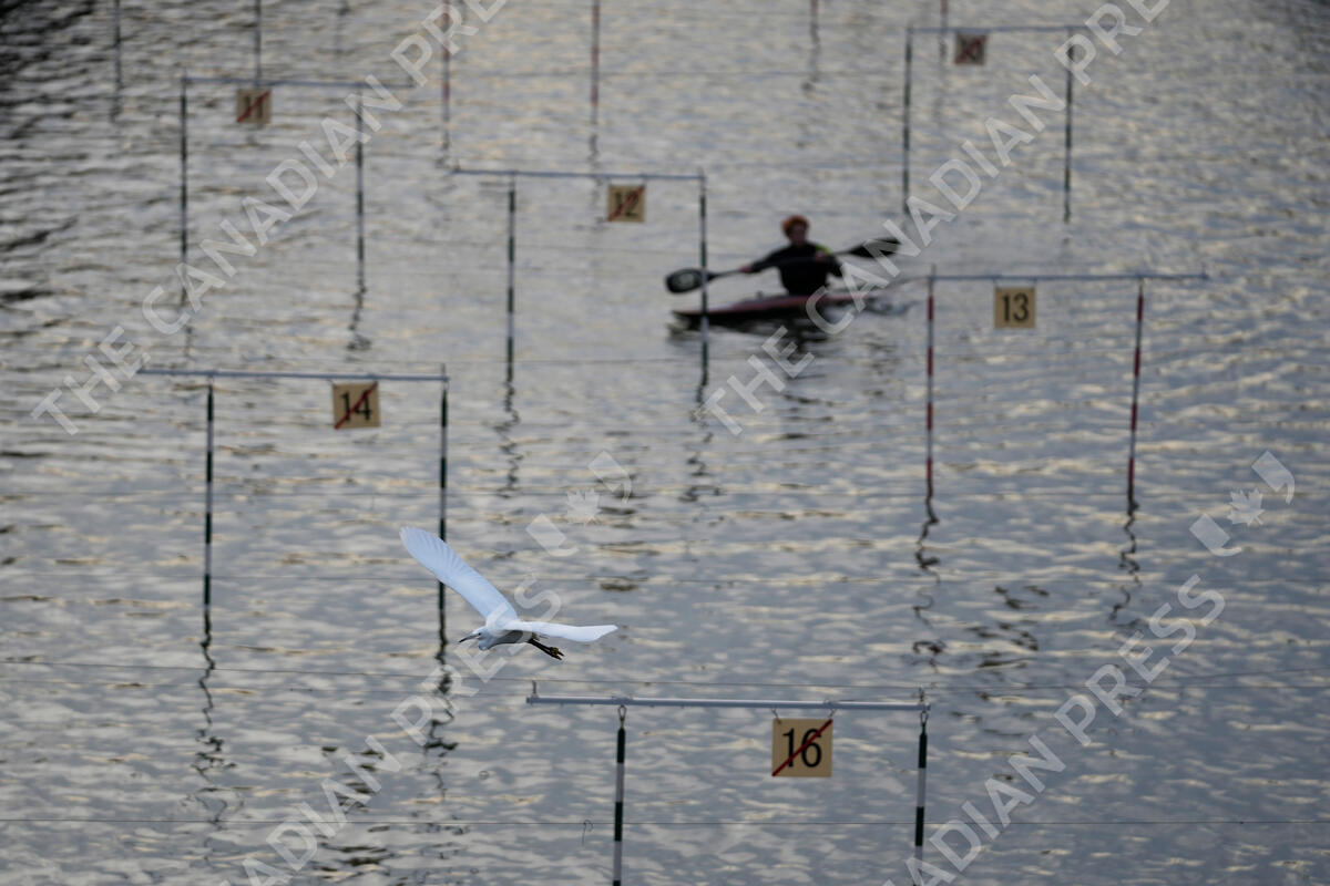 A white water bird flies over Takuma Udagawa as he practices kayak slalom skills at a park in Tokyo, Thursday, Nov. 4, 2021. (AP Photo/Hiro Komae)