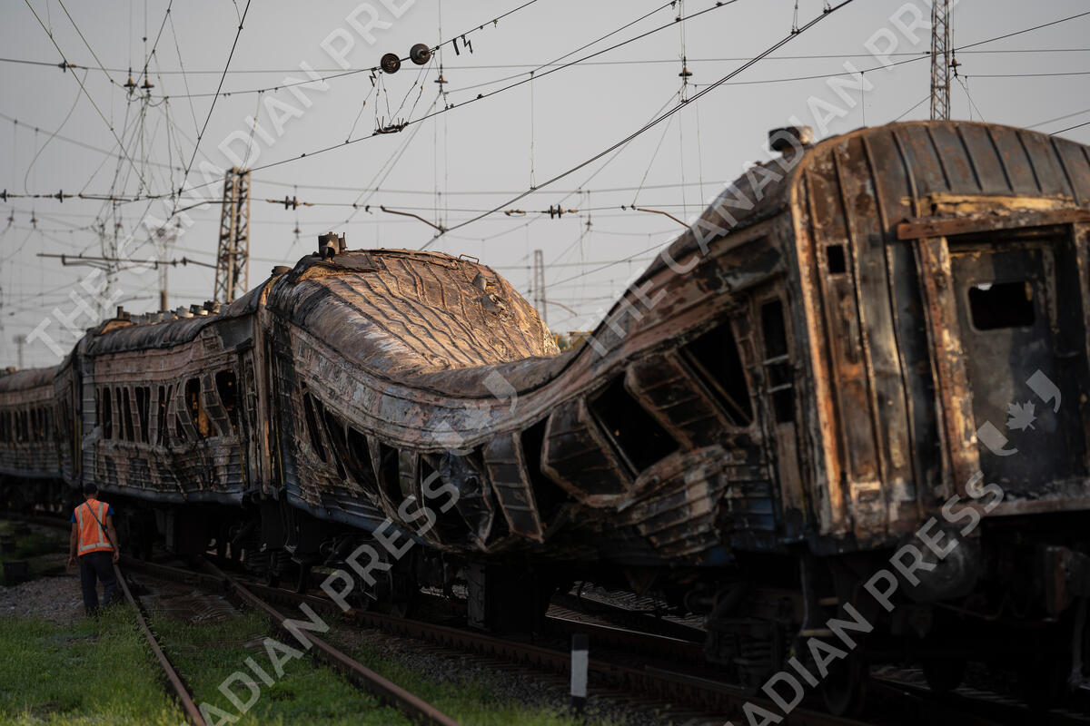 A railway worker stands next to heavily damaged train after a Russian attack on a train station yesterday during Ukraine's Independence Day in the village Chaplyne, Ukraine, Thursday, Aug. 25, 2022. (AP Photo/Leo Correa)