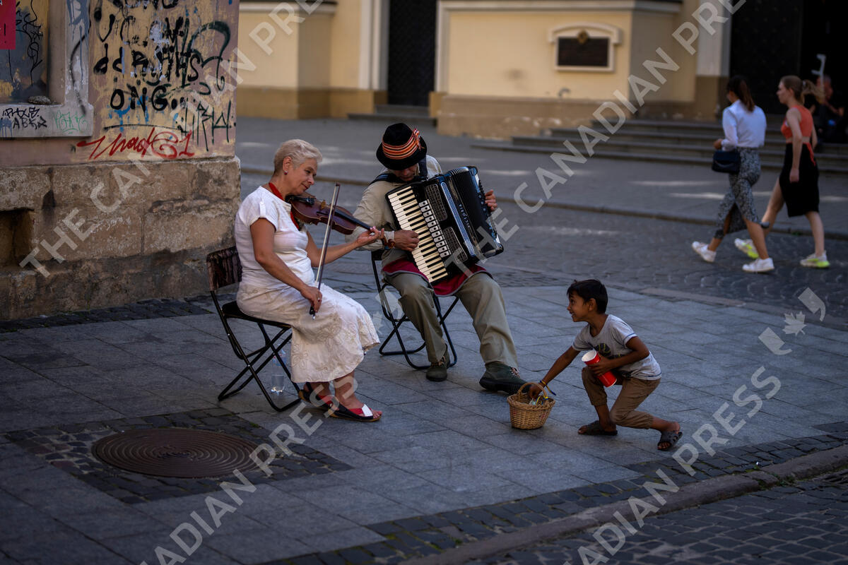 A child tries to steal money from street musicians playing in downtown Lviv, Ukraine, Friday, Aug. 26, 2022. (AP Photo/Emilio Morenatti)