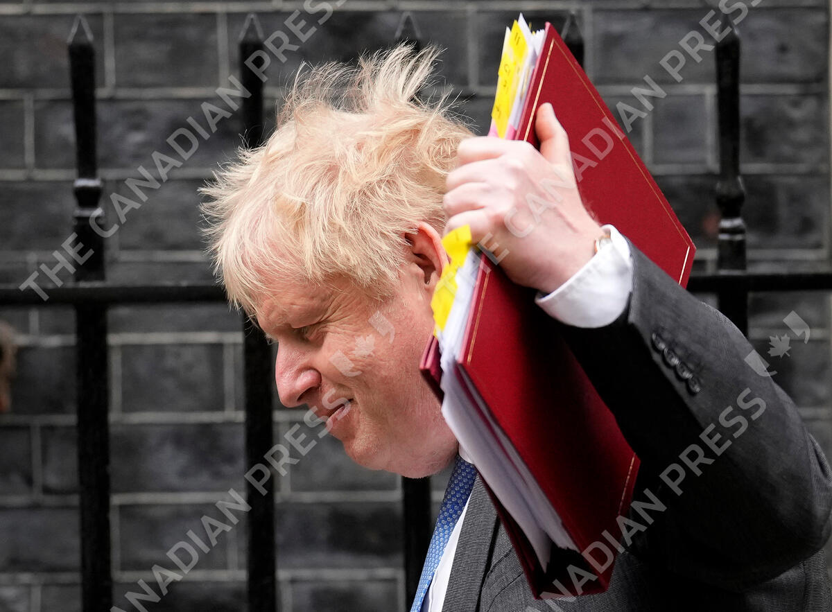 FILE - British Prime Minister Boris Johnson waves his folder at the media as he leaves 10 Downing Street to attend the weekly Prime Minister's Questions at the Houses of Parliament, in London, April 27, 2022. The moving vans have already started arriving in Downing Street, as Britain's Conservative Party prepares to evict Johnson. Debate about what mark he will leave on his party, his country and the world will linger long after he departs in September. (AP Photo/Matt Dunham, File)