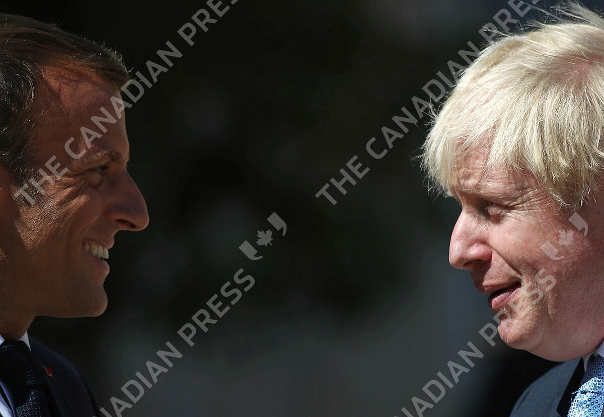 FILE - French President Emmanuel Macron welcomes Britain's Prime Minister Boris Johnson at the Elysee Palace, Thursday, Aug. 22, 2019 in Paris. The moving vans have already started arriving in Downing Street, as Britain's Conservative Party prepares to evict Johnson. Debate about what mark he will leave on his party, his country and the world will linger long after he departs in September. (AP Photo/Daniel Cole, File)