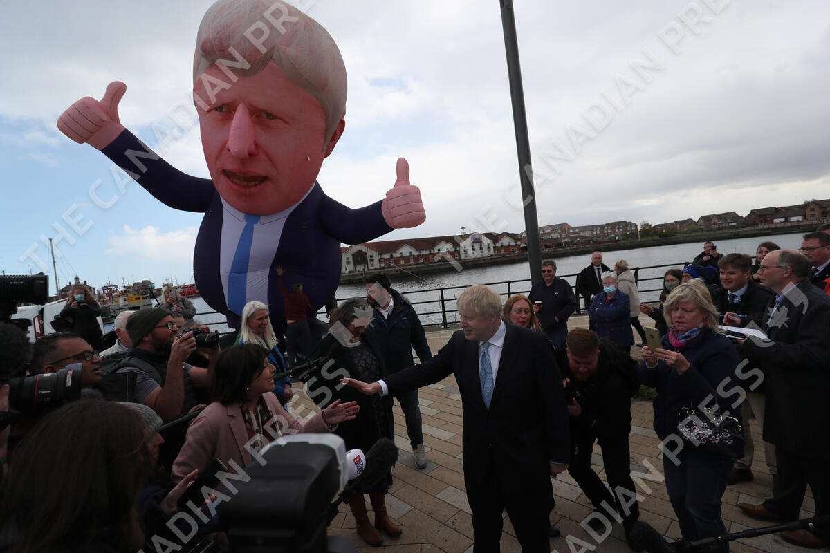 FILE - British Prime Minister Boris Johnson speaks to the media next to a large inflatable of him, after Conservative Party candidate Jill Mortimer won the Hartlepool by-election, at Hartlepool Marina, in Hartlepool, north east England, Friday, May 7, 2021. The moving vans have already started arriving in Downing Street, as Britain's Conservative Party prepares to evict Johnson. Debate about what mark he will leave on his party, his country and the world will linger long after he departs in September. (AP Photo/Scott Heppell, File)
