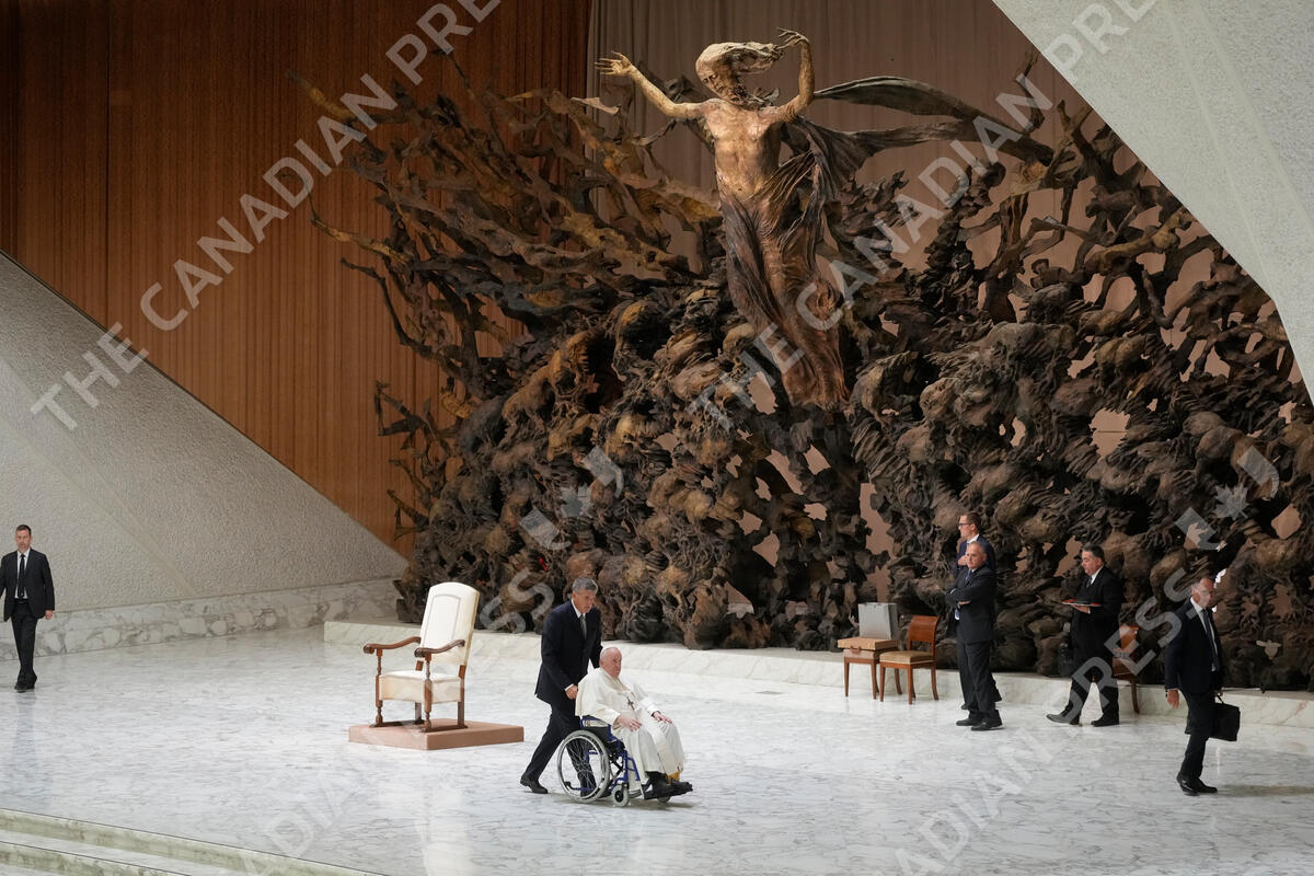 Pope Francis leaves on a wheelchair at the end of his weekly general audience in the Paul VI Hall at The Vatican, Wednesday, Aug. 24, 2022. (AP Photo/Gregorio Borgia)