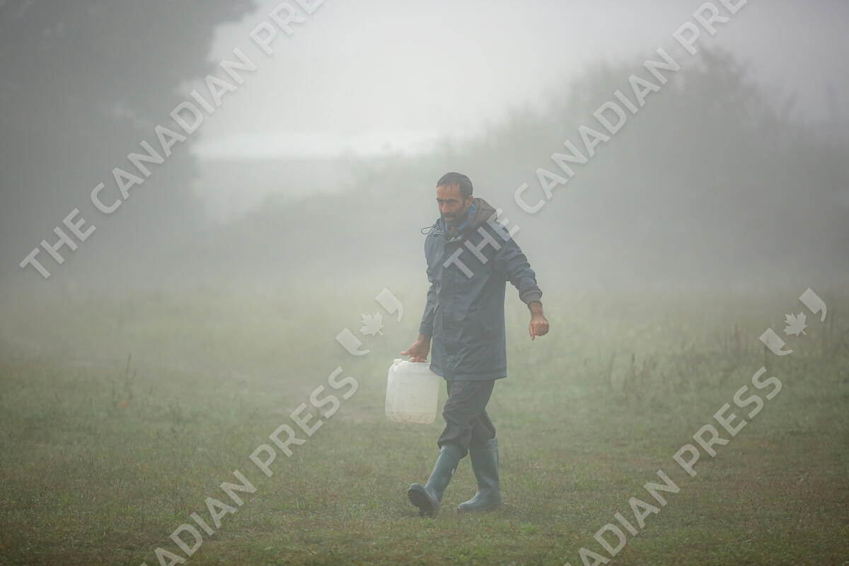 A migrant man carries drinking water on a foggy morning at a makeshift camp housing migrants mostly from Afghanistan, in Velika Kladusa, Bosnia, Tuesday, Oct. 12, 2021. The make-shift settlement has no running water, no toilettes, showers or electricity, making it very hard for migrants to keep warm or clean, especially during foggy and humid fall nights. There are fears how people will cope as freezing Bosnian winter approaches. (AP Photo)