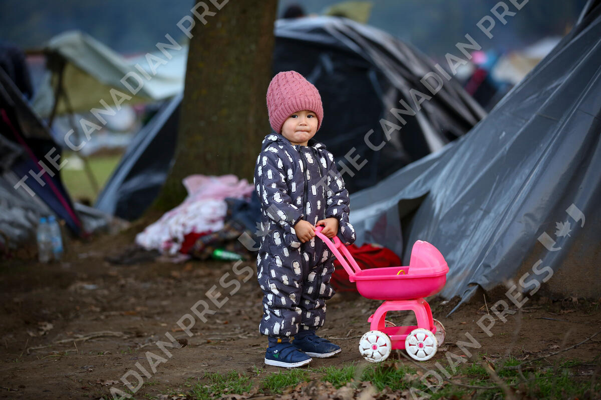 A migrant child stands next to a toy baby stroller while posing for a photograph at a makeshift camp housing migrants mostly from Afghanistan, in Velika Kladusa, Bosnia, Tuesday, Oct. 12, 2021. (AP Photo)
