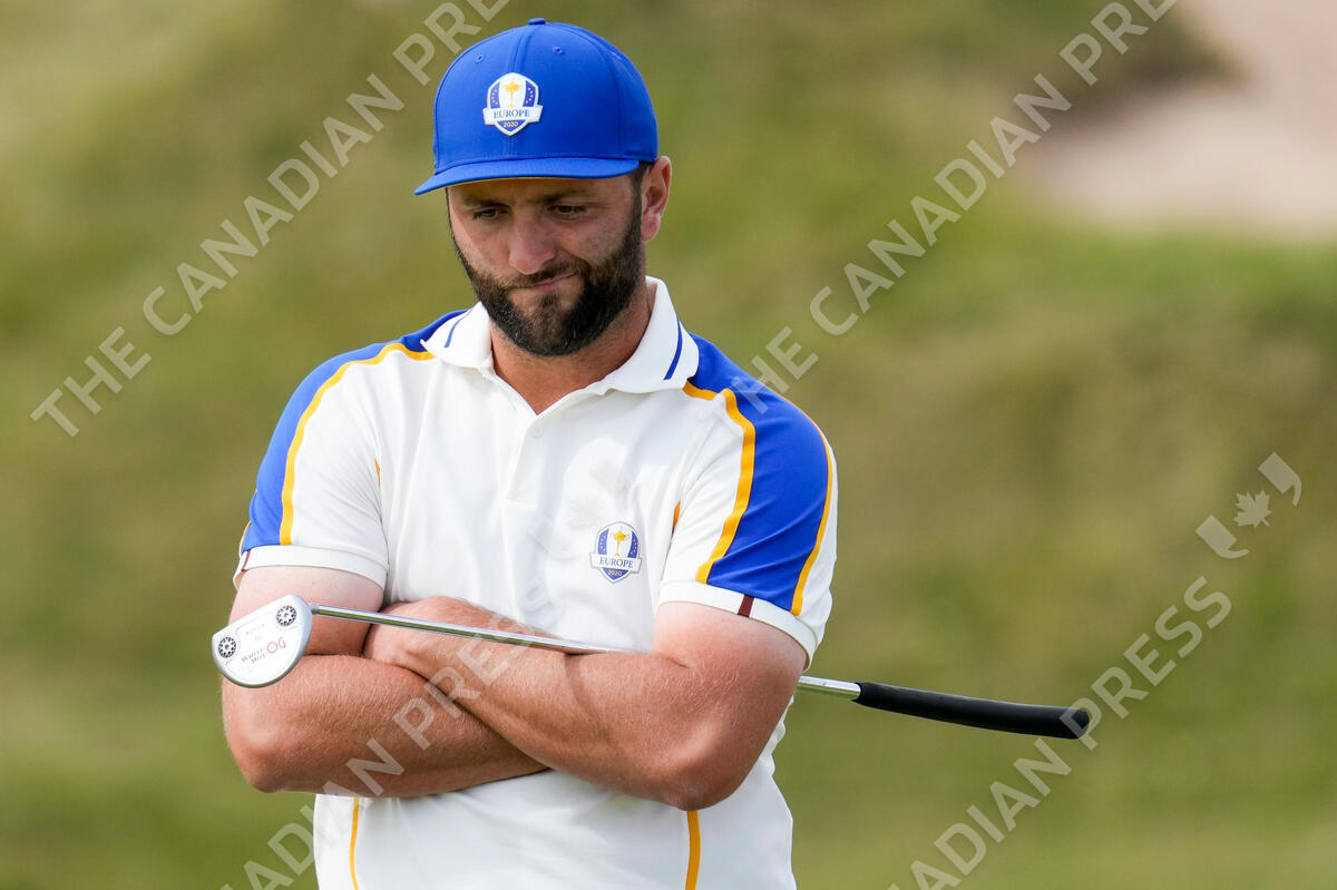 Team Europe's Jon Rahm reacts after missing a putt on the 10th hole during a Ryder Cup singles match at the Whistling Straits Golf Course Sunday, Sept. 26, 2021, in Sheboygan, Wis. (AP Photo/Ashley Landis)