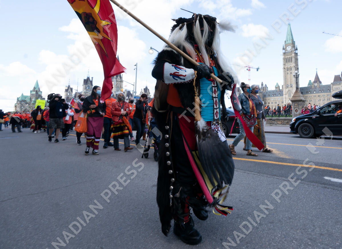 Participants in the National Day for Truth and Reconciliation ceremonies leave Parliament hill, Thursday, September 30, 2021 in Ottawa. THE CANADIAN PRESS/Adrian Wyld