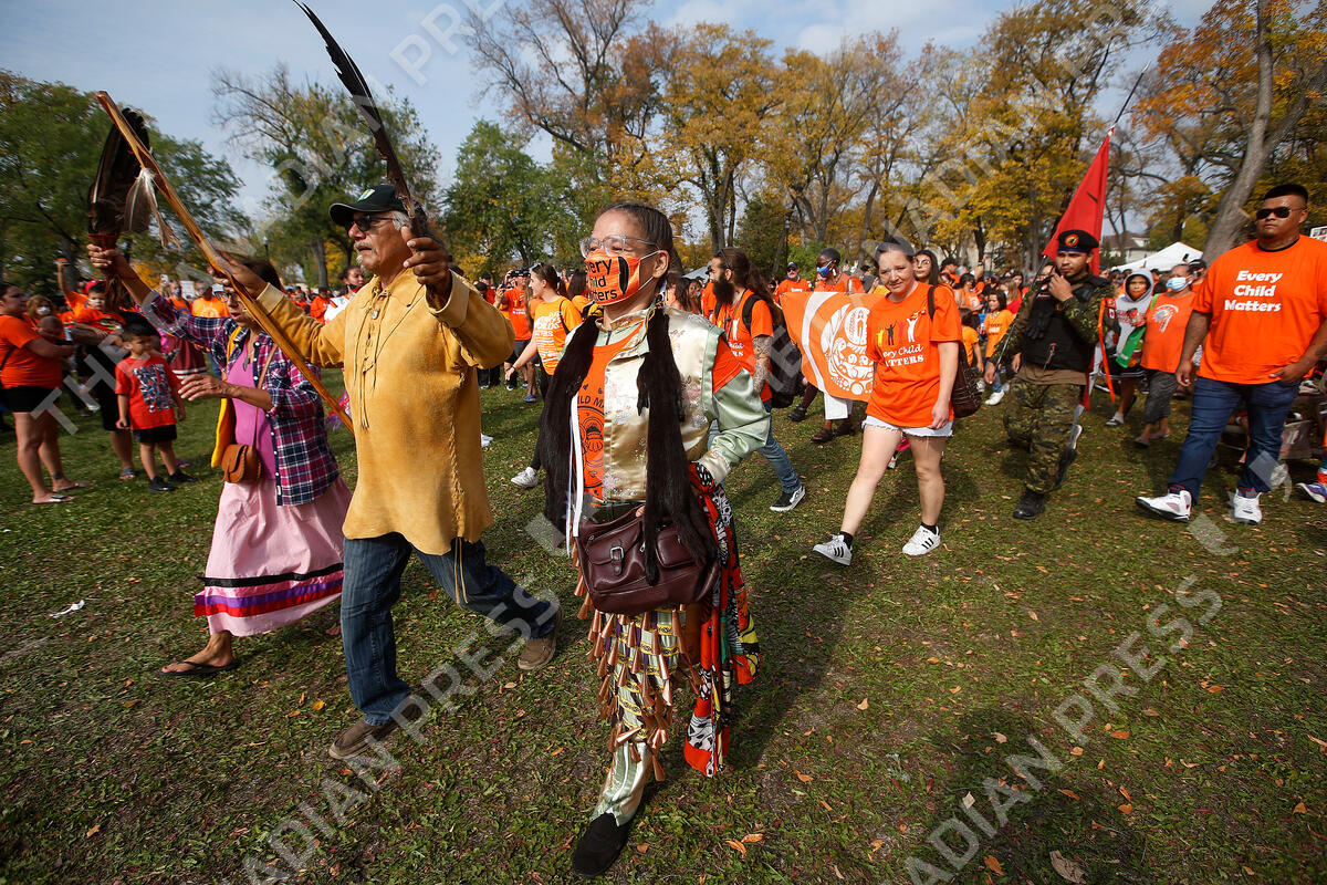 Several thousand gathered for a Healing Walk throughout downtown Winnipeg and a Powwow on the National Day for Truth And Reconciliation Thursday, September 30, 2021. THE CANADIAN PRESS/John Woods
