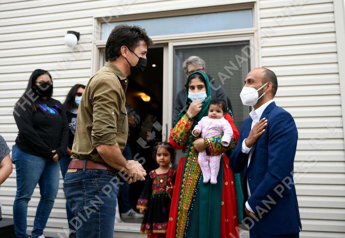 Prime Minister Justin Trudeau greets Obaidullah Rahimi, right, his wife Arezoo, and daughters Hawa, 2 months, and Ayat, 3, in Ottawa, on Saturday, Oct. 9, 2021. Obaidullah Rahimi worked at the Canadian Embassy in Afghanistan; his family is one of 22 resettled Afghan families in the Ottawa area. THE CANADIAN PRESS/Justin Tang