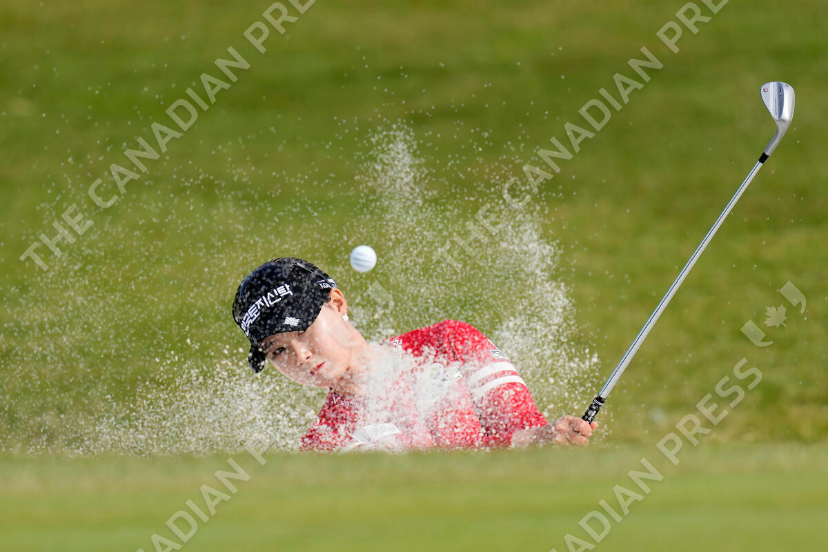 Hee Jeong Lim of South Korea hits out of a bunker on the ninth hole during the final round of the BMW Ladies Championship at LPGA International Busan in Busan, South Korea, Sunday, Oct. 24, 2021. (AP Photo/Lee Jin-man)