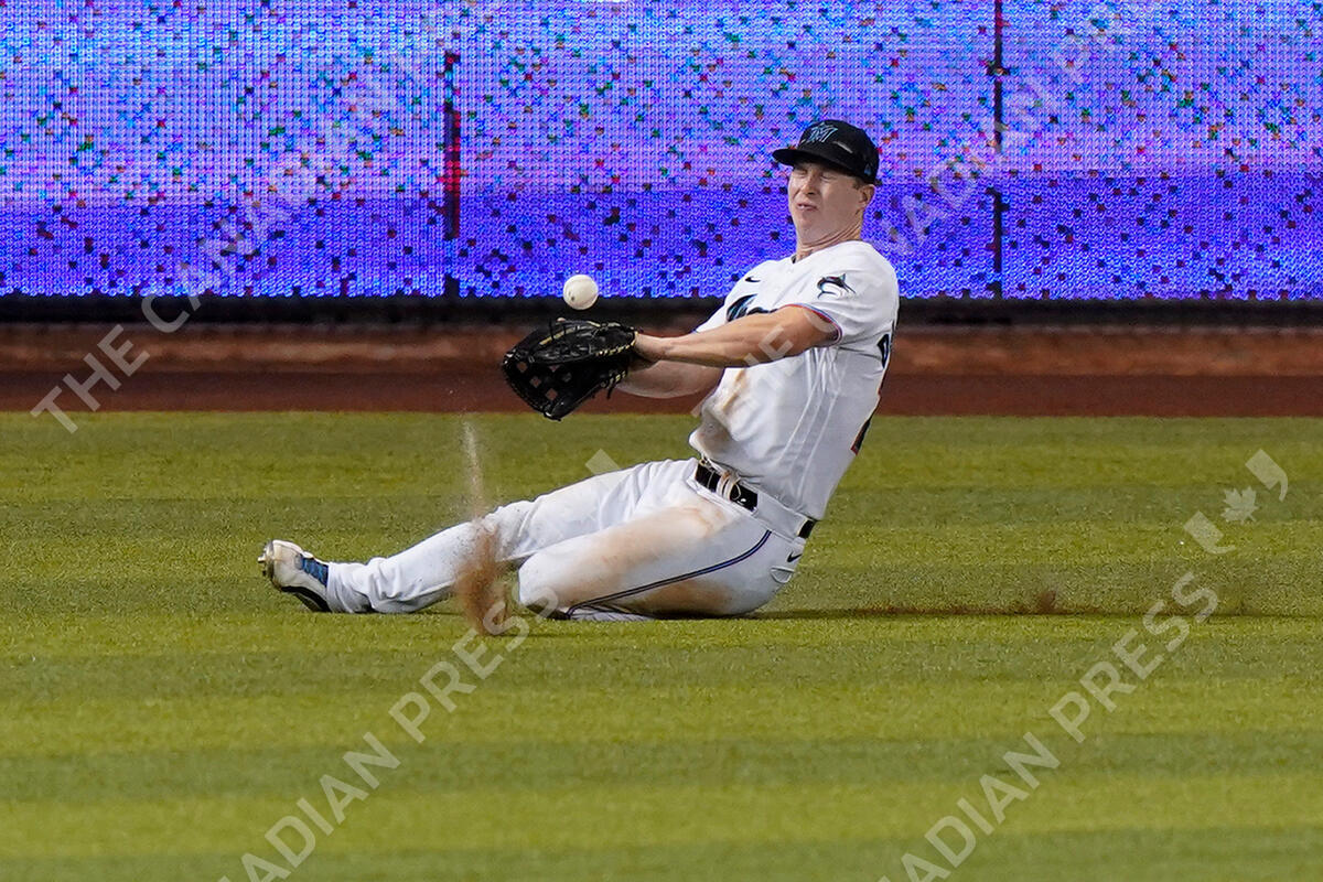 Miami Marlins left fielder Corey Dickerson is unable to catch a ball hit by Philadelphia Phillies' Jean Segura for a double scoring Andrew McCutchen during the ninth inning of a baseball game, Monday, May 24, 2021, in Miami. (AP Photo/Wilfredo Lee)