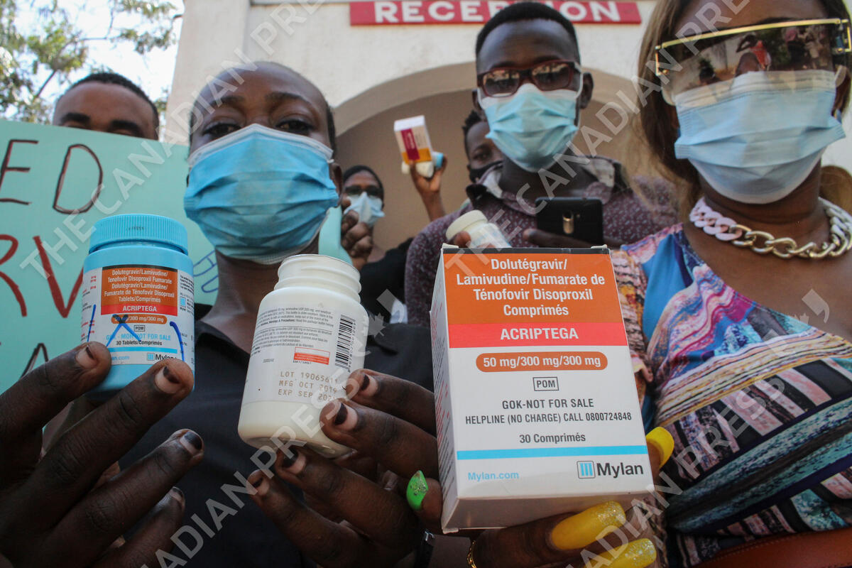 Protesters hold empty containers of anti-retroviral (ARV) medicines during a demonstration over shortages of ARVs, organized by people living with HIV or AIDS, sex-workers, members of the LGBT community, and their supporters, in the port city of Mombasa, Kenya, Thursday, April 22, 2021. Kenyans living with HIV say their lives are in danger due to a shortage of anti-retroviral drugs donated by the United States amid a dispute between the U.S. aid agency and the Kenyan government. (AP Photo)