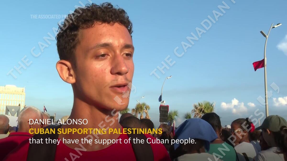 Thousands of people waving Cuban and Palestinian flags and handmade banners gathered outside the U.S. Embassy on Thursday, led by President Miguel Díaz-Canel, to show solidarity with the Palestinian people and demand an end to the war in the Middle East. (AP Video: Ariel Fernández and Milexsy Durán)