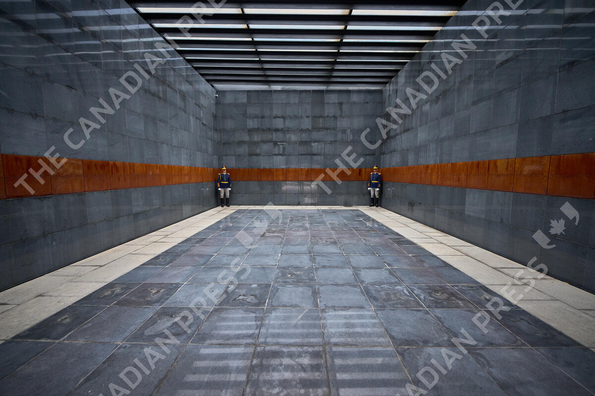 Honor guard soldiers stand at the Holocaust Memorial during the ceremony marking the National Holocaust Memorial Day in Bucharest, Romania, Thursday, Oct. 9, 2025. (AP Photo/Vadim Ghirda)