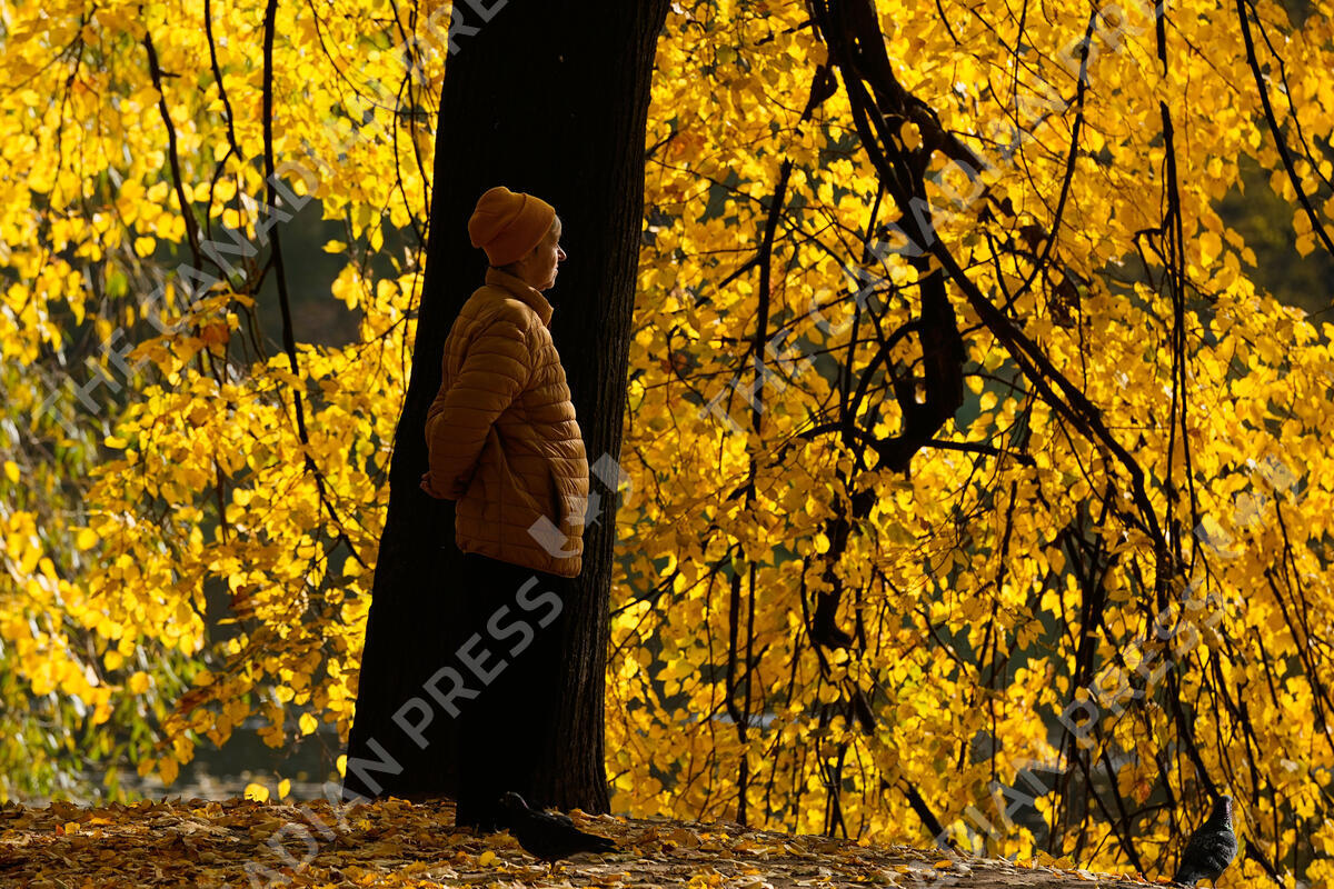 A woman walks through Lefortovsky park as foliage shows fall color in Moscow, Russia, Thursday, Oct. 9, 2025. (AP Photo/Pavel Bednyakov)