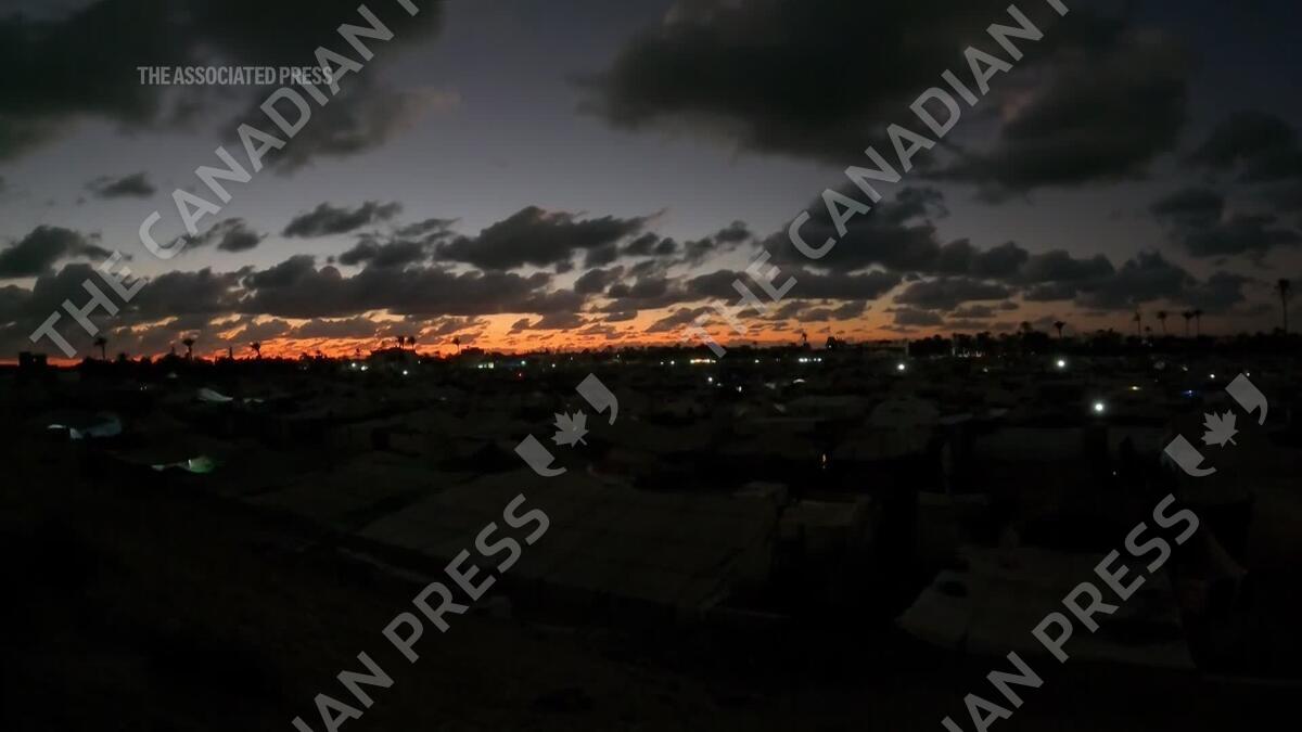 Timelapse from day to night of vast central Gaza tent camp housing displaced Palestinians