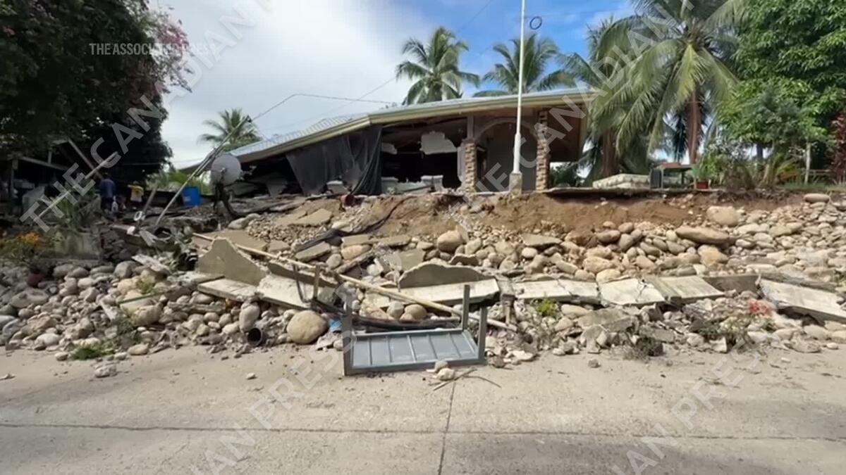 Two powerful offshore earthquakes struck the same region in the southern Philippines hours apart on Friday with the first 7.4 magnitude temblor killing at least seven people, setting off landslides and prompting evacuations of coastal areas nearby because of a brief tsunami scare. (AP Video/Jeoffrey Maitem)