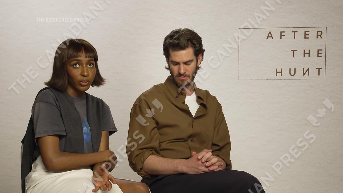 During an interview at the London Film Festival for their latest film "After The Hunt," Ayo Edebiri and Andrew Garfield share their shock at hearing Diane Keaton has died. (Oct. 12)