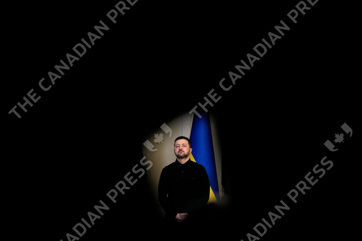 Ukraine's President Volodymyr Zelenskyy listens as High Representative of the European Union for Foreign Affairs and Security Policy Kaja Kallas speaks during a news conference, Monday, Oct. 13, 2025, in Kyiv, Ukraine. (AP Photo/Julia Demaree Nikhinson)