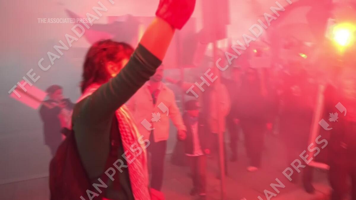 Pro-Palestinian protesters lit flares and waved flags as they marched to a stadium in Oslo where a soccer World Cup qualifier between Norway and Israel was set to be played on Saturday. (AP video shot by: Kostya Manenkov)